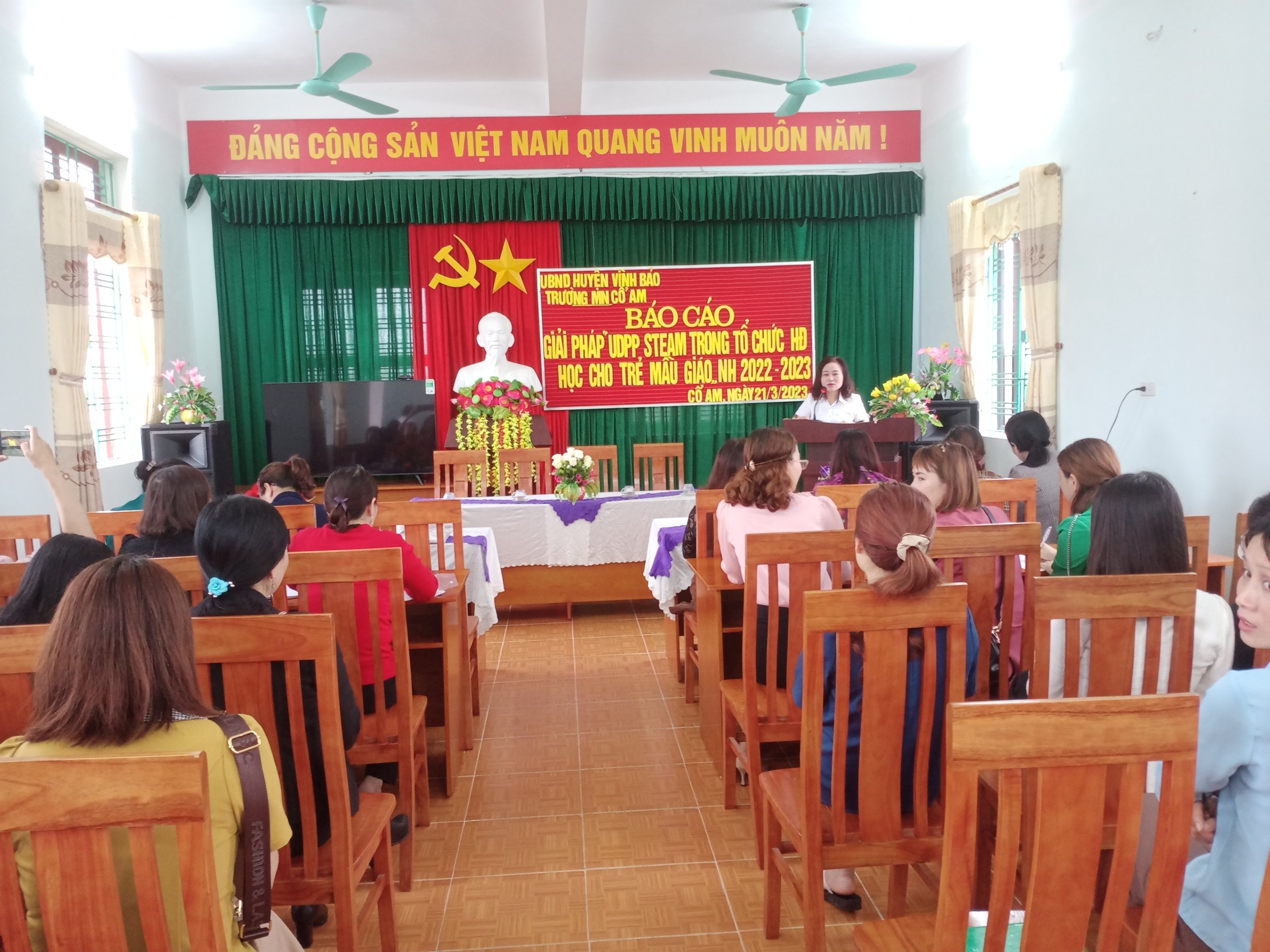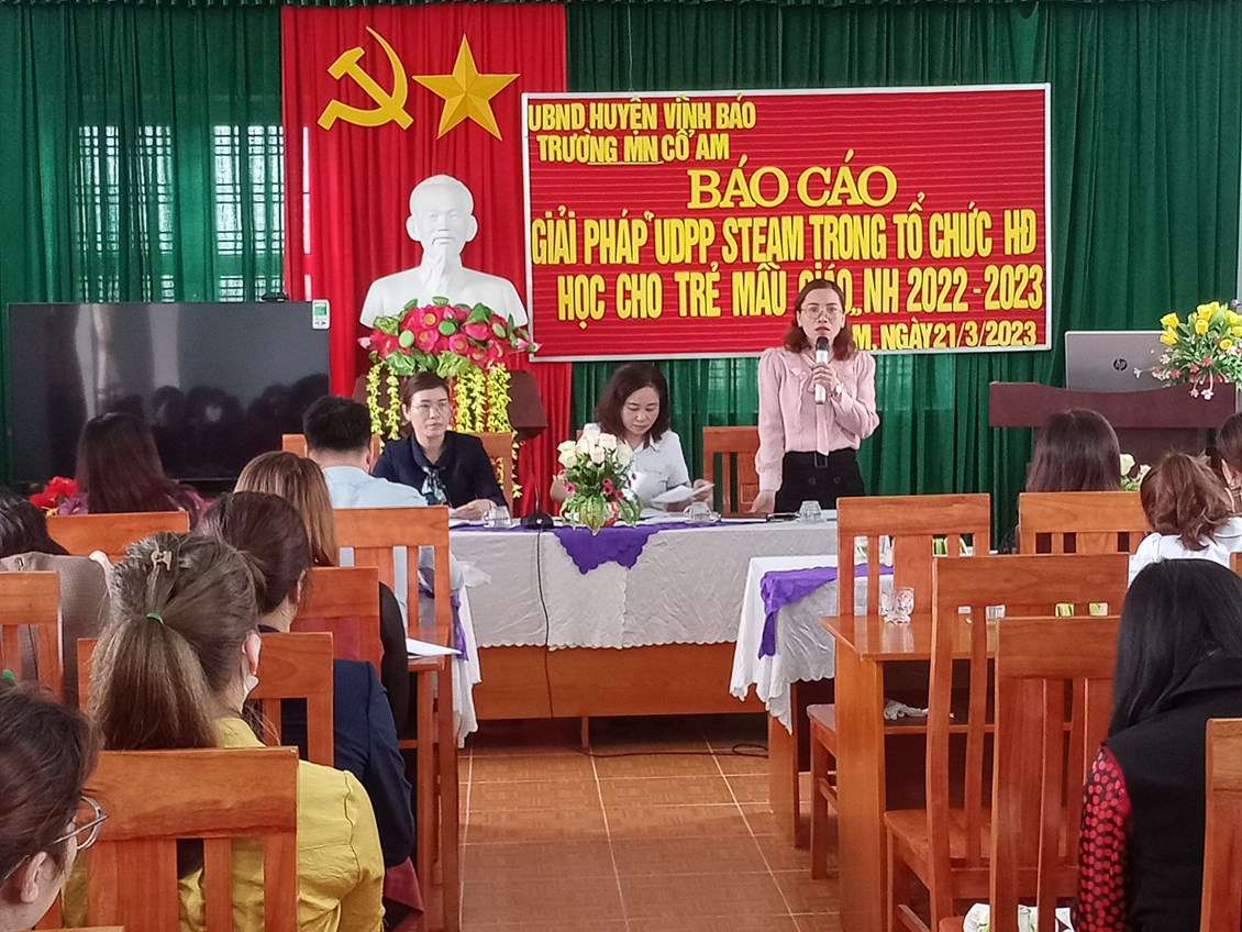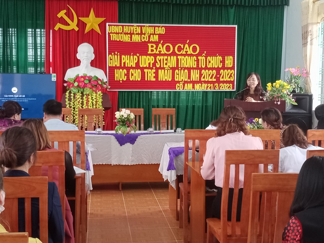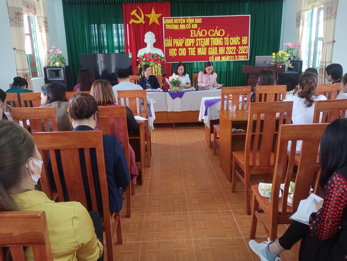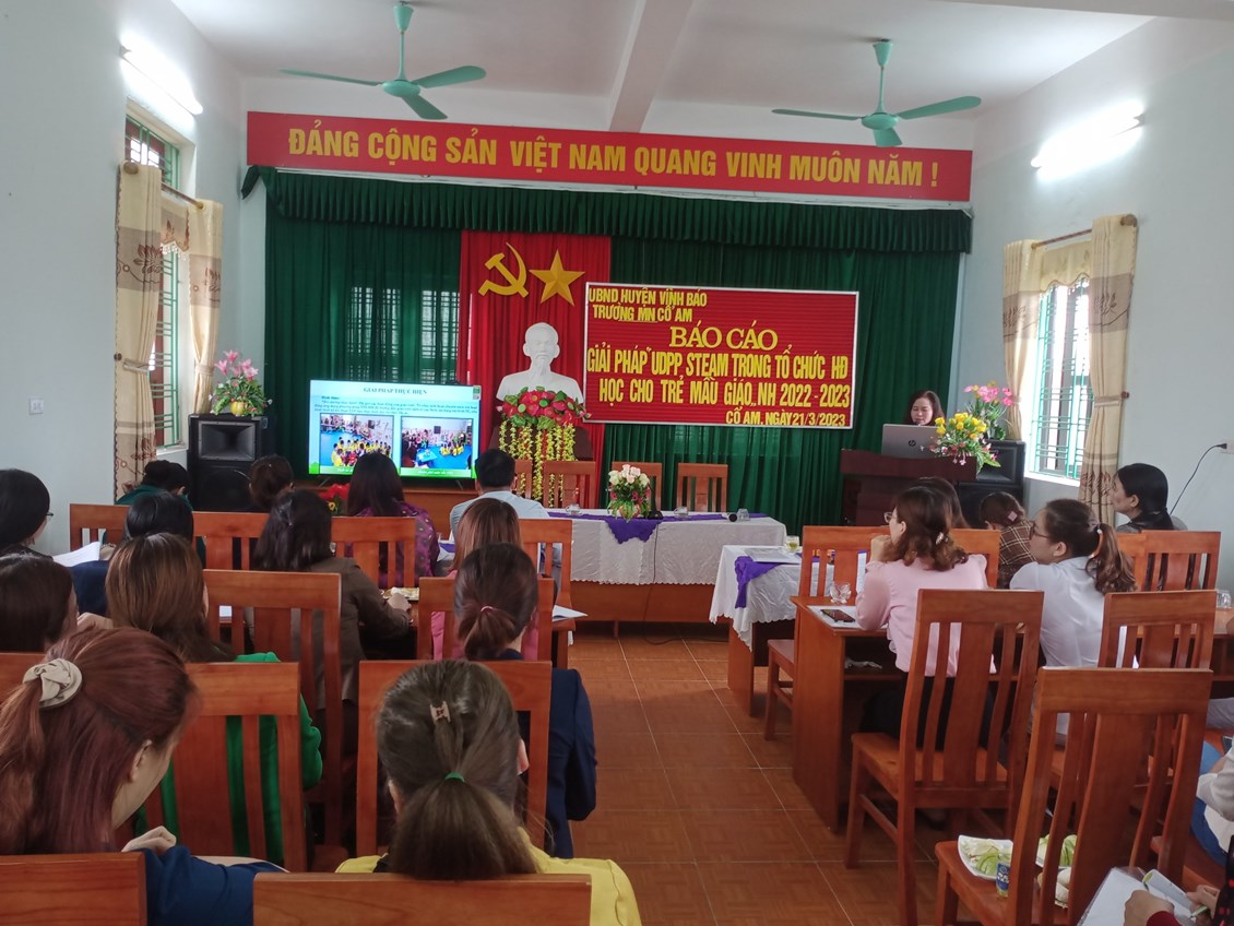 Tham dự Báo cáo giải pháp sáng tạo có các đồng chí lãnh đạo, chuyên viên phòng Giáo dục và Đào tạo huyện Vĩnh Bảo; Khối thi đua bậc học mầm non; đồng chí cụm trưởng, cụm phó cụm Mầm non Cổ Am; các đồng chí Hiệu trưởng, Phó hiệu trưởng phụ trách chuyên môn giáo dục, giáo viên cốt cán và đại diện cha mẹ trẻ.