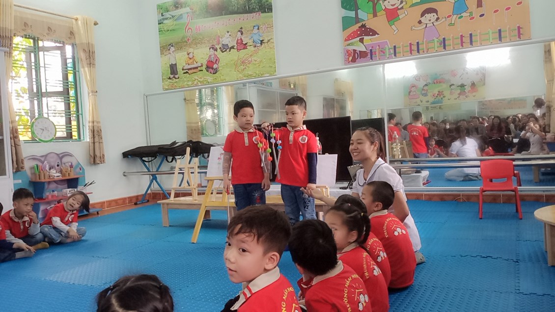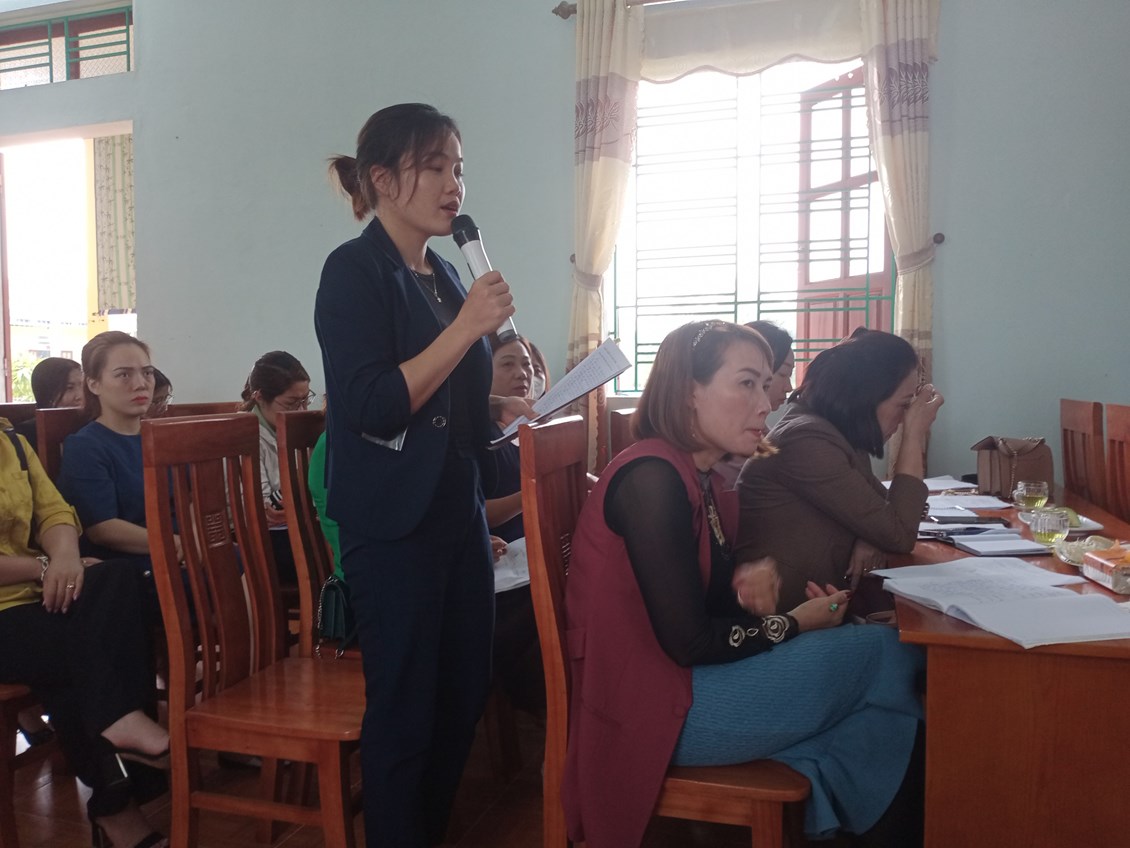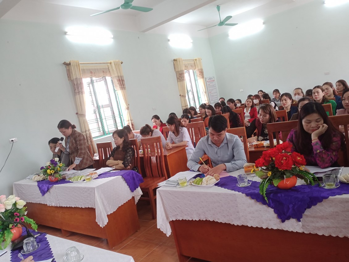Sau khi dự các hoạt động, các đại biểu nghe đồng chí Vũ Thị Nguyệt- hiệu trưởng nhà trường trình bày báo cáo kết quả thực hiện giải pháp. Các vị đại biểu thảo luận, trao đổi ý kiến, rút kinh nghiệm các hoạt động được dự giờ, thăm quan.