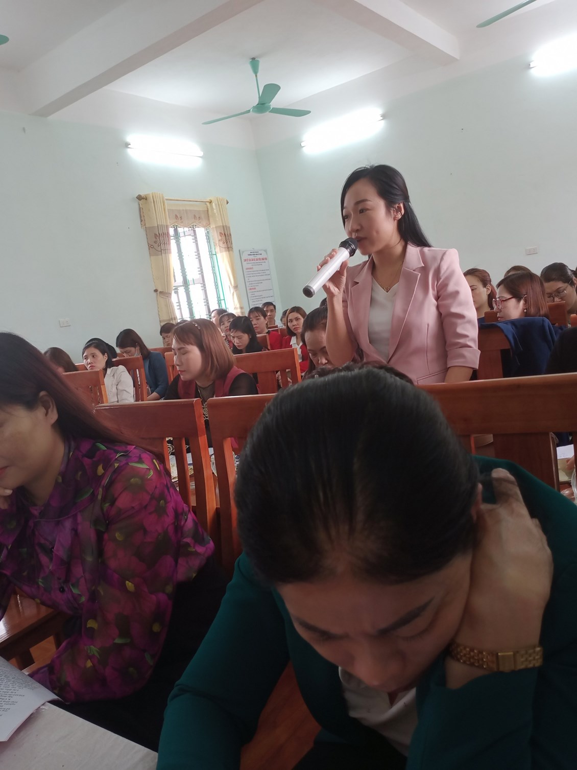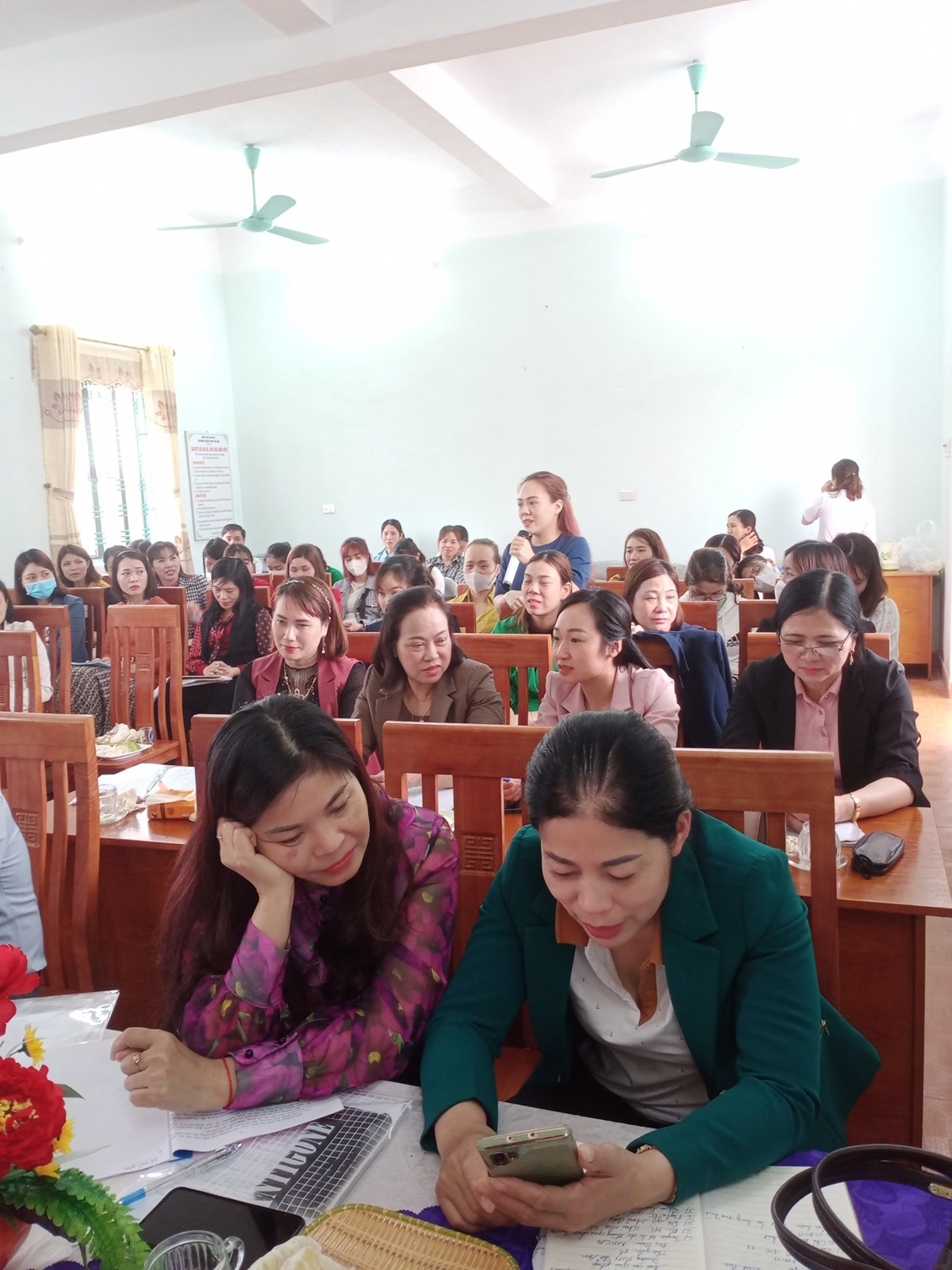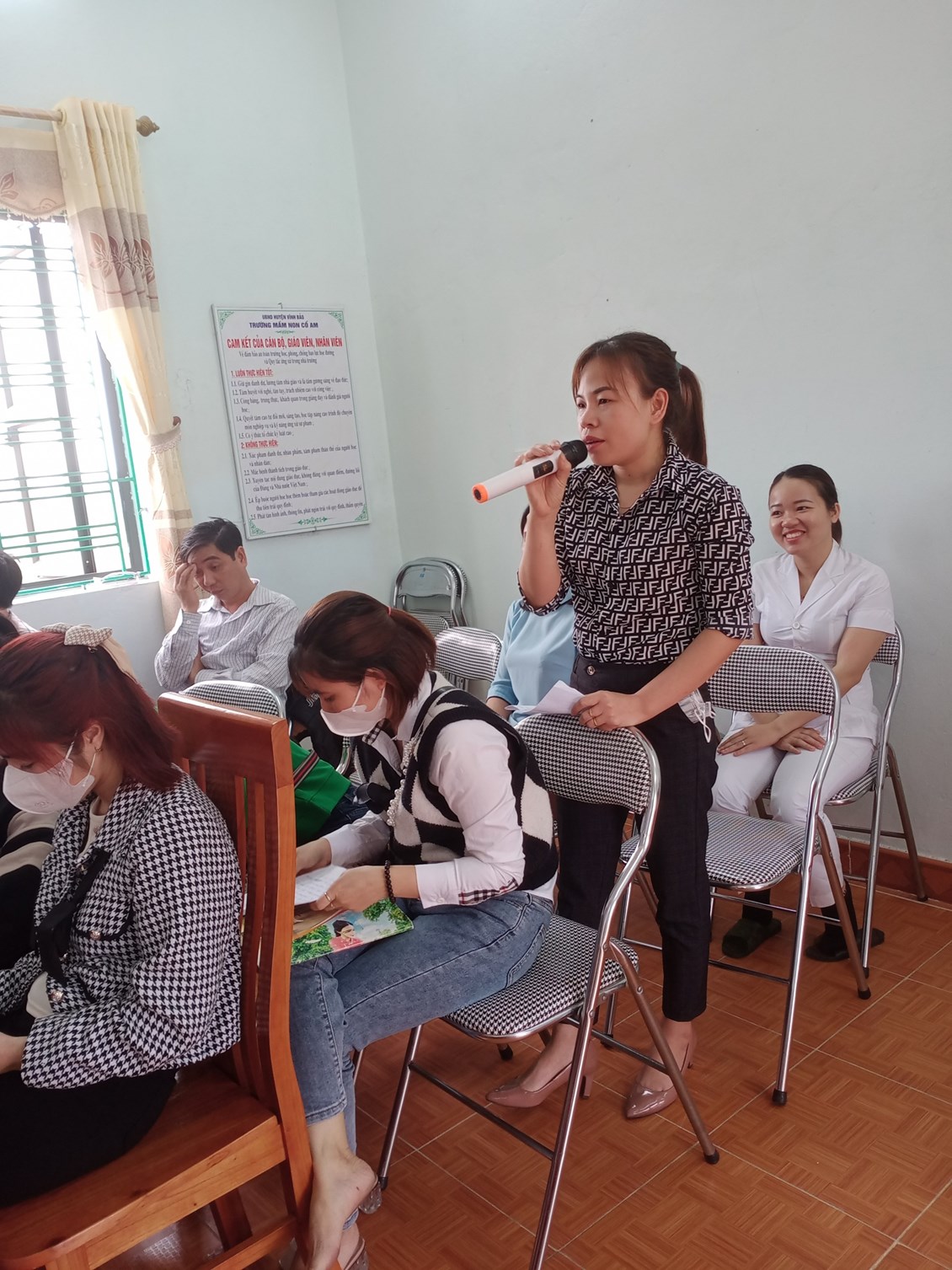 Sau khi dự các hoạt động, các đại biểu nghe đồng chí Vũ Thị Nguyệt- hiệu trưởng nhà trường trình bày báo cáo kết quả thực hiện giải pháp. Các vị đại biểu thảo luận, trao đổi ý kiến, rút kinh nghiệm các hoạt động được dự giờ, thăm quan.