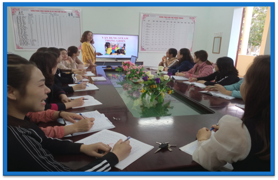 Để triển khai việc sinh hoạt tổ chuyên môn một cách hiệu quả, bài bản, ngay từ đầu năm học nhà trường đã tổ chức lớp tập huấn, bồi dưỡng cho đội ngũ giáo viên, nhân viên trong trường về mục đích, tầm quan trọng của việc tổ chức sinh hoạt tổ chuyên môn. Phân công nhiệm vụ cho tổ trưởng tổ chuyên môn xây dựng lịch sinh hoạt tổ chuyên môn năm học 2022- 2023 mỗi tháng sinh hoạt chuyên môn ít nhất 02 lần. Lịch sinh hoạt chuyên môn của tổ phải đảm bảo bám sát kế hoạch chung của nhà trường, việc lựa chọn nội dung sinh hoạt tổ chuyên môn đảm bảo toàn diện các nội dung nuôi dưỡng, chăm sóc, giáo dục, phù hợp với nhiệm vụ trọng tâm của nhà trường, nhu cầu bồi dưỡng thực tế của đội ngũ giáo viên, nhân viên trong trường, được lấy ý kiến thảo luận, thống nhất của cán bộ, giáo viên, nhân viên từ đầu năm học. Chú trọng các nội dung về chuyên đề “Xây dựng trường mầm non lấy trẻ làm trung tâm; chương trình “Tôi yêu Việt Nam”; chuyển đổi số trong dạy và học; việc ứng dụng mô hình giáo dục tiên tiến STEAM vào tổ chức hoạt động học.....Kế hoạch phải cụ thể, chi tiết, rõ ràng từ việc nêu phương hướng nhiệm vụ, chỉ tiêu phấn đấu, các biện pháp thực hiện đến việc phân công người thực hiện, thời gian hoàn thành.