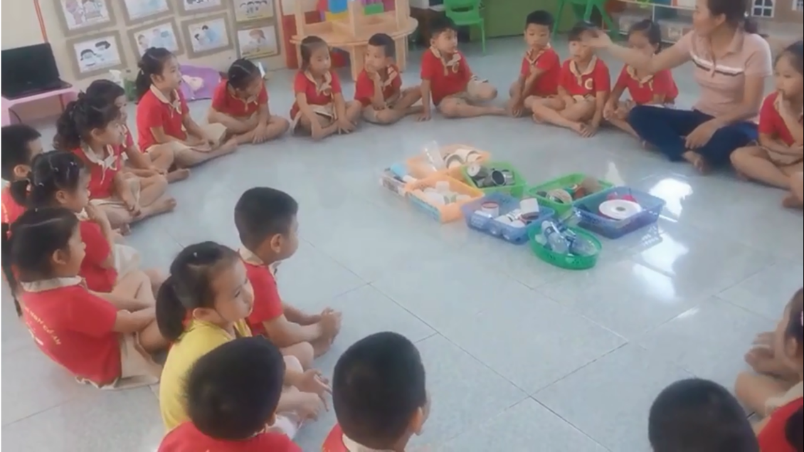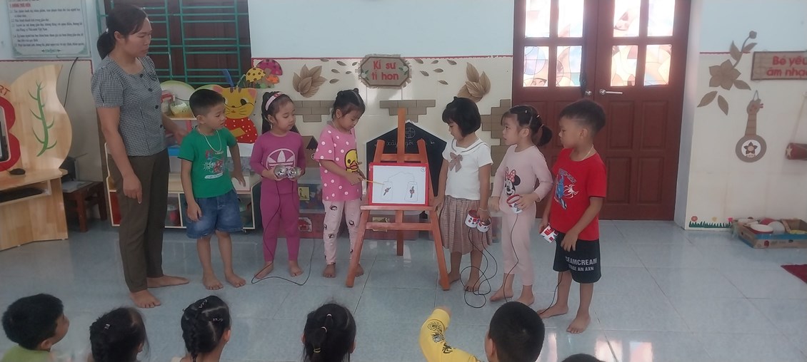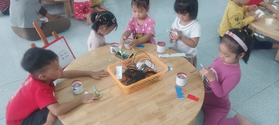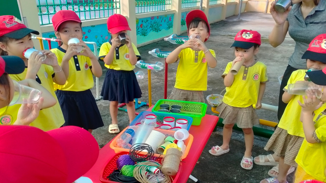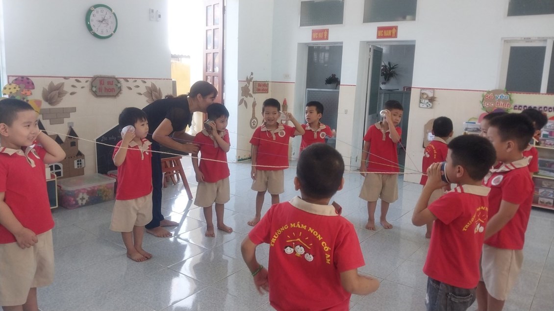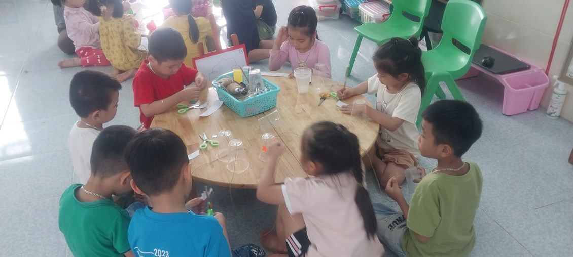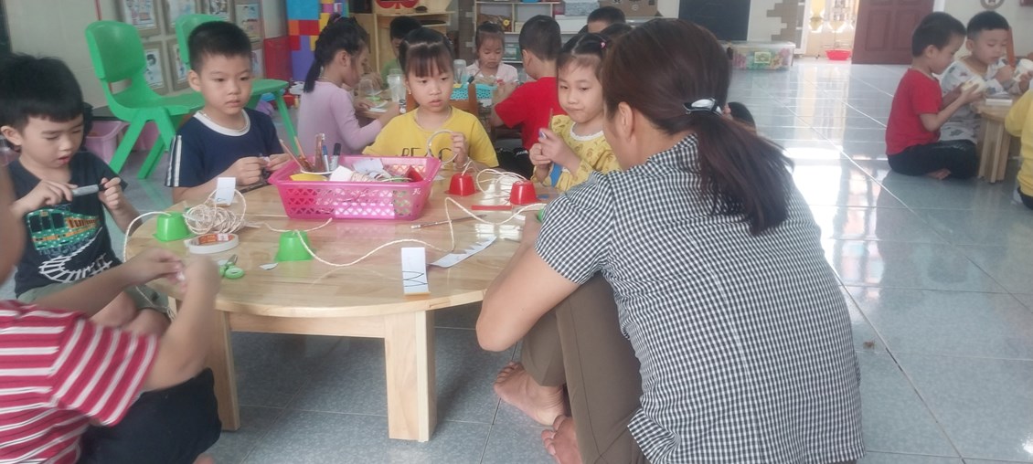 thanh khác nhau như thế nào. Kết thúc dự án, trẻ cảm thấy vui tươi phấn khởi vì đã biết phối hợp cùng các bạn chế tạo ra điện thoại có dây dẫn âm thanh, trân trọng giữ gìn sản phẩm mình tạo ra.