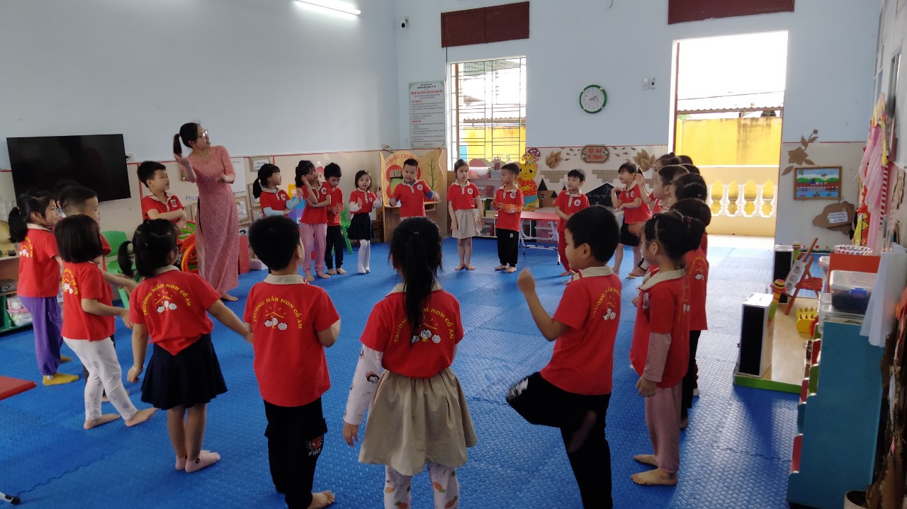 Vận động theo nhạc giúp trẻ phát triển cảm giác nhịp điệu, sự khéo léo, khả năng phản ứng nhanh và đúng các ấn tượng nghe được trong âm nhạc. Ngoài ra, nó còn thỏa mãn nhu cầu tình cảm của trẻ, trẻ được tự do thể hiện, bộc lộ cảm xúc của mình, được giao tiếp với bạn bè xung quanh. Sau đây xin kính mời các bậc phụ huynh cùng quan sát một số hình ảnh trong giờ hoạt động âm nhạc của trẻ lớp 5T2: