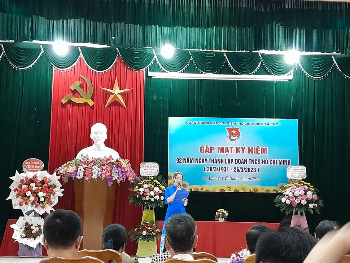 Thực hiện Chương trình công tác năm 2023; Thực hiện kế hoạch số 10-KH/ĐTN ngày 21/02/2023 của BCH Huyện đoàn Vĩnh Bảo về việc tổ chức các hoạt động tháng Thanh niên 2023 chào mừng kỉ niệm 92 năm ngày thành lập Đoàn TNCS Hồ Chí Minh (26/03/1931-26/03/2023). Được sự nhất trí của Huyện đoàn Vĩnh Bảo, Đảng uỷ - UBND - UBMTTQ Việt Nam xã Cổ Am, buổi chiều ngày 25/03/2023, Đoàn TNCS Hồ Chí Minh 8 xã Cụm I đã tổ chức thành công chương trình "Gặp mặt kỉ niệm 92 năm ngày thành lập Đoàn TNCS Hồ Chí Minh (26/03/1931-26/03/2023)".