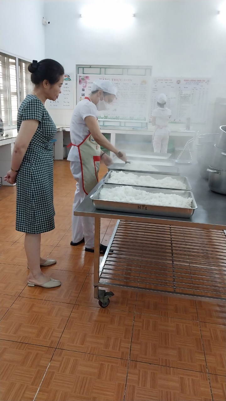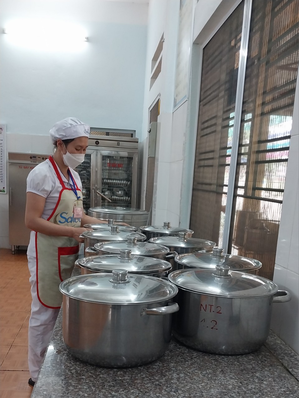 Ban giám hiệu và tổ nuôi kiểm soát chặt chẽ nguồn gốc thực phẩm và các khâu: chế biến, bảo quản vận chuyển thực phẩm, tuân thủ và thực hiện đầy đủ các quy trình giao nhận, kiểm thực ba bước, lưu thực phẩm với đầy đủ các thành phần là ban giám hiệu, kế toán, y tế, bếp, giáo viên và phụ huynh. Nhà trường thực hiện nghiêm túc các quy định trong quản lý chăm sóc nuôi dưỡng (quy trình bếp một chiều, thực hiện nhiệm vụ theo phân công dây chuyền, quản lý khẩu phần ăn; công khai minh bạch trên thực đơn, hồ sơ sổ sách, biểu bảng…) Nhà trường chủ động tăng cường công tác tự kiểm tra việc thực hiện các quy định về đảm bảo vệ sinh an toàn thực phẩm tại bếp ăn. Nhân viên cấp dưỡng thực hiện tốt quy trình bếp một chiều, lưu mẫu thực phẩm. Thực hiện xếp sắp đồ dùng, đồ dùng sống, chín rõ ràng. Dụng cụ nấu ăn như Xoong cơm, canh, xoong đun nước riêng, chảo rán riêng. Xoong chia thực phẩm chín dùng riêng và được nhúng nước sôi trước khi ăn, xoong đựng thực phẩm sống riêng. Dụng cụ chế biến gồm dao, thớt, xô, chậu đầy đủ, cối xay thịt. Dụng cụ nấu ăn vệ sinh sạch sẽ hàng ngày, để đồ dùng sống riêng, chín riêng. Những dụng cụ chế biến phải được rửa ngay sau khi sử dụng, lau khô, để đúng nơi quy định. Trong quá trình chế biến, nấu không được để dụng cụ, thực phẩm trực tiếp xuống đất mà phải đặt trên kệ, bàn, ghế.