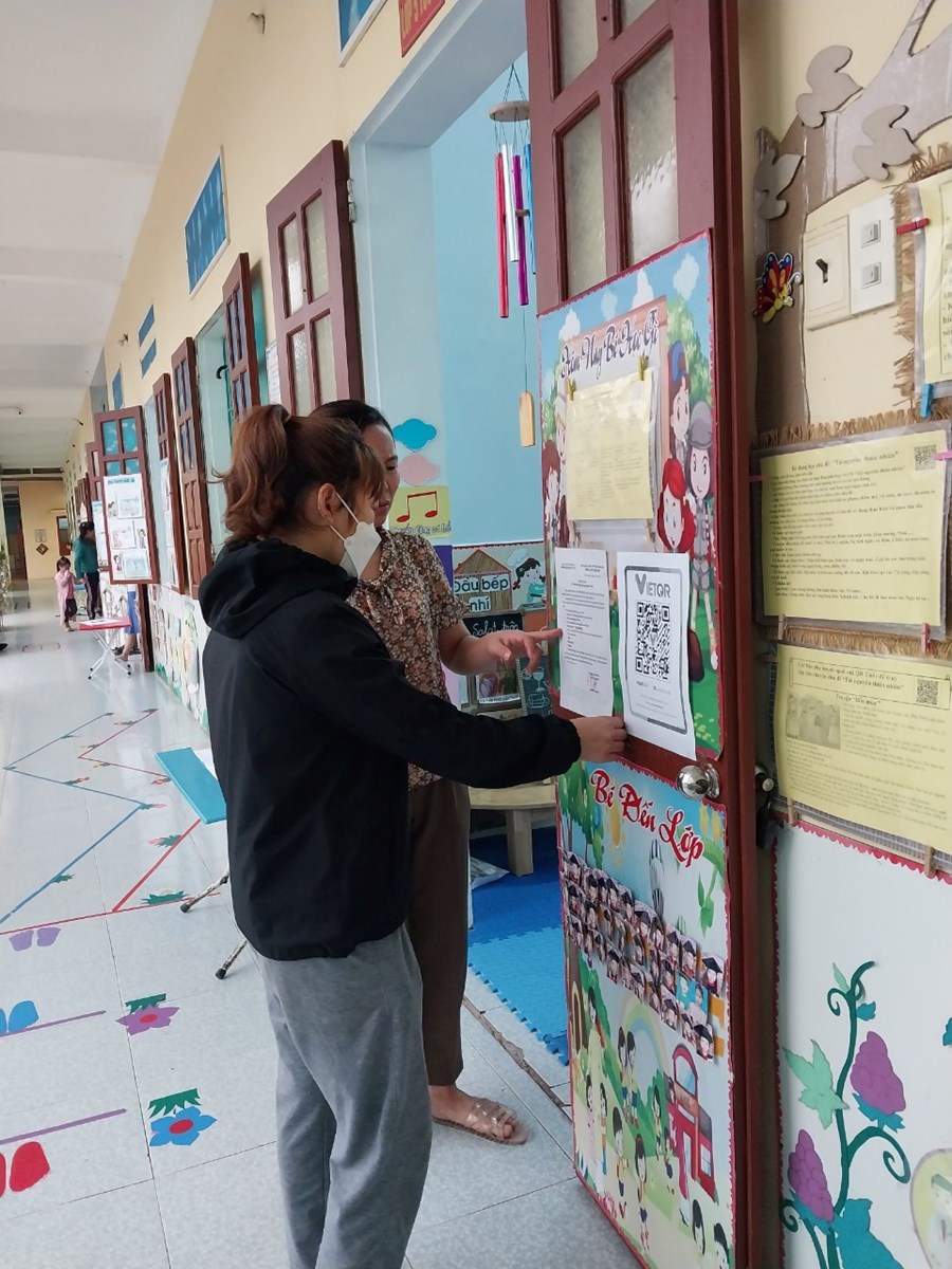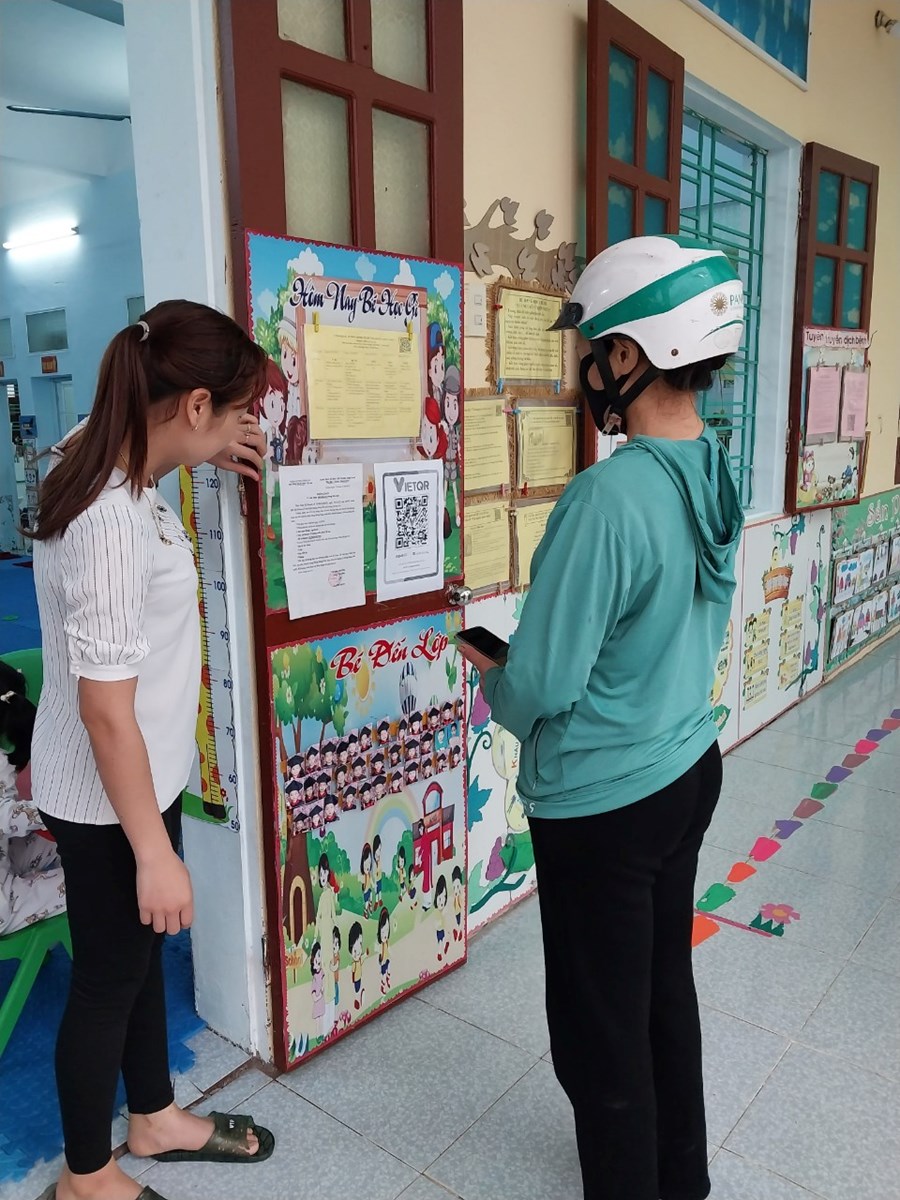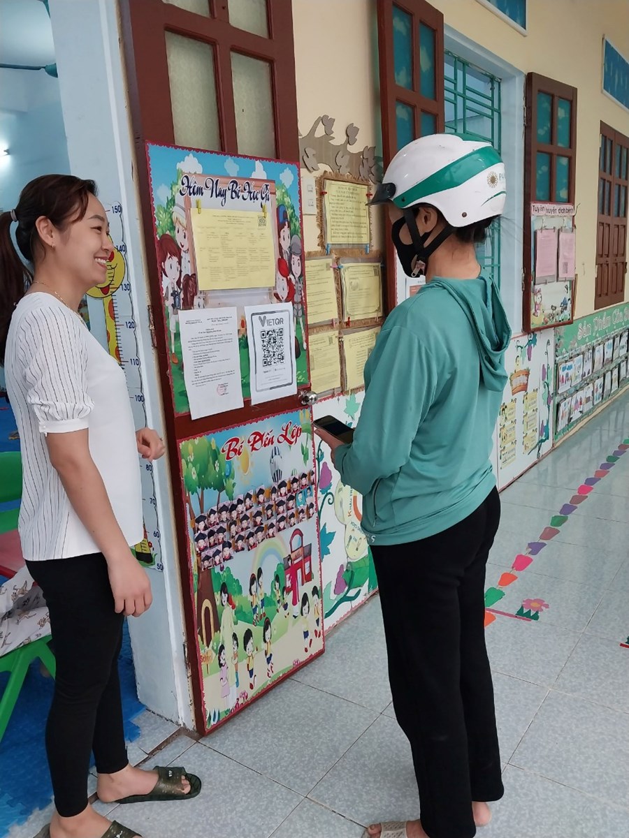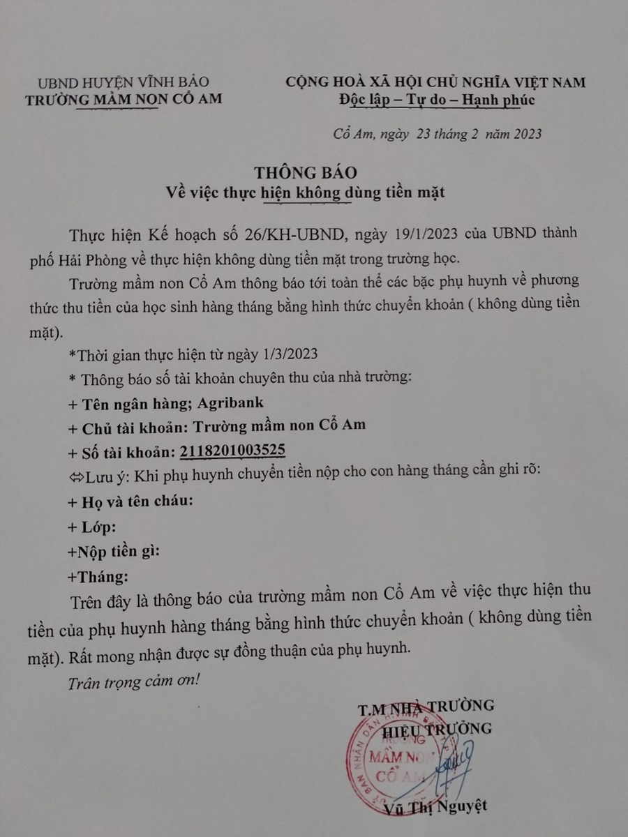 Để đẩy nhanh tiến độ thanh toán không dùng tiền mặt, đồng chí Hiệu trưởng nhà trường hướng dẫn giáo viên tuyên truyền tới phụ huynh thông qua các giờ đón- trả trẻ, nhóm zalo của lớp, buổi họp phụ huynh về việc thực hiện thanh toán khong dùng tiền mặt trong nhà trường. Đồng thời ra thông báo gửi tới toàn thể phụ huynh học sinh.