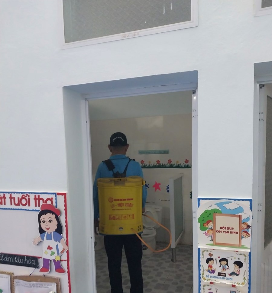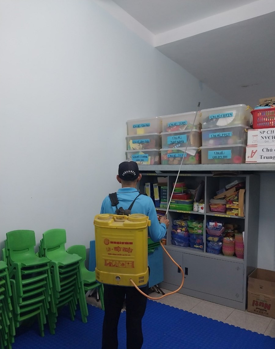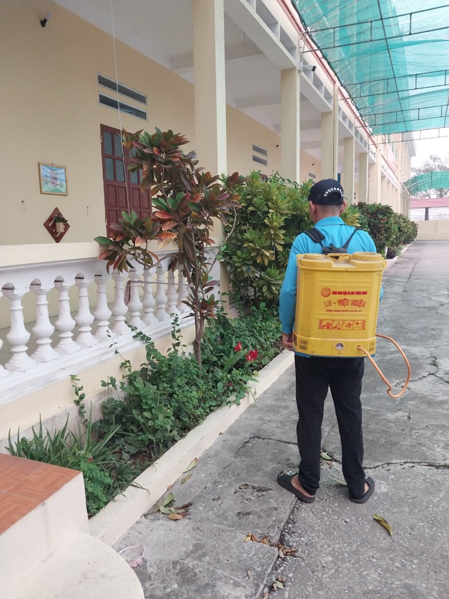 Phun thuốc muỗi khu vực ngoài lớp học và bếp ăn